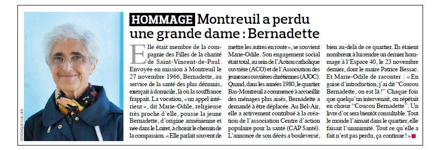 Le CAPS a eu la grande peine de perdre son ancienne présidente et cofondatrice, qui a œuvré avec générosité pendant de nombreuses années auprès des familles de la Ville de Montreuil.
